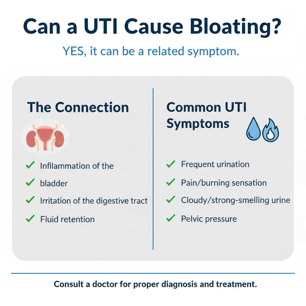 A UTI can cause bloating, but it’s not a defining symptom. Bloating usually results from bladder inflammation, urinary retention, or medication side effects. If bloating is ongoing or occurs alone, further evaluation is recommended.
